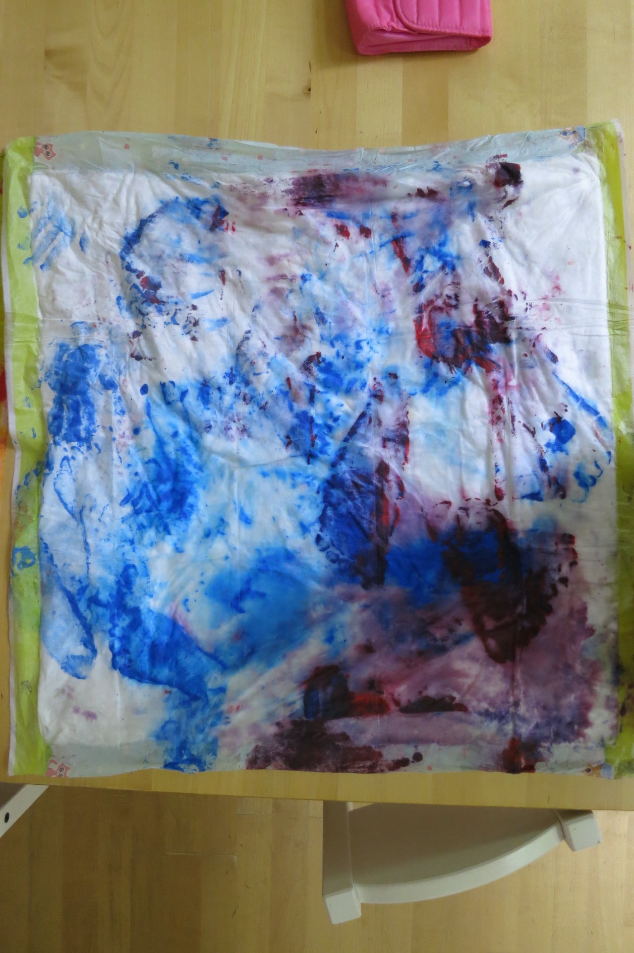 Das Bild wurde geknautscht, zusammengefaltet und abgedruckt, wieder gegossen, wieder bemalt,…..wodurch spannende Farbverläufe entstanden.