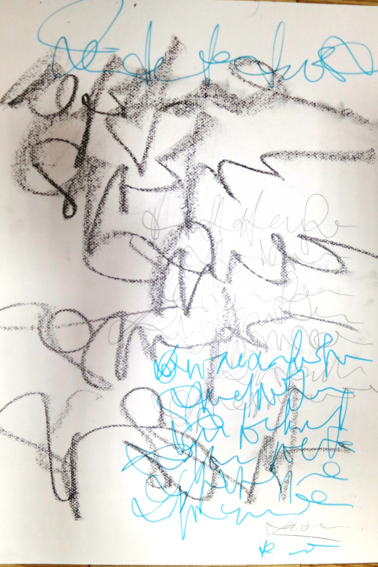 Die erste Aufwärmübung besteht darin, ein Gedicht zu schreiben, zumindest imaginär, ohne Buchstaben aber in einem Schreibfluss. Claudia zeigt vor, wie das aussehen könnte und alleine das Beobachten, wie sie achtsam den Bleistift aufs Papier setzt und dann losschwingt, verzaubert mich und ich könnt ihr wohl stundenlang dabei zusehen. Aber noch besser ist das Selberschreiben 🙂