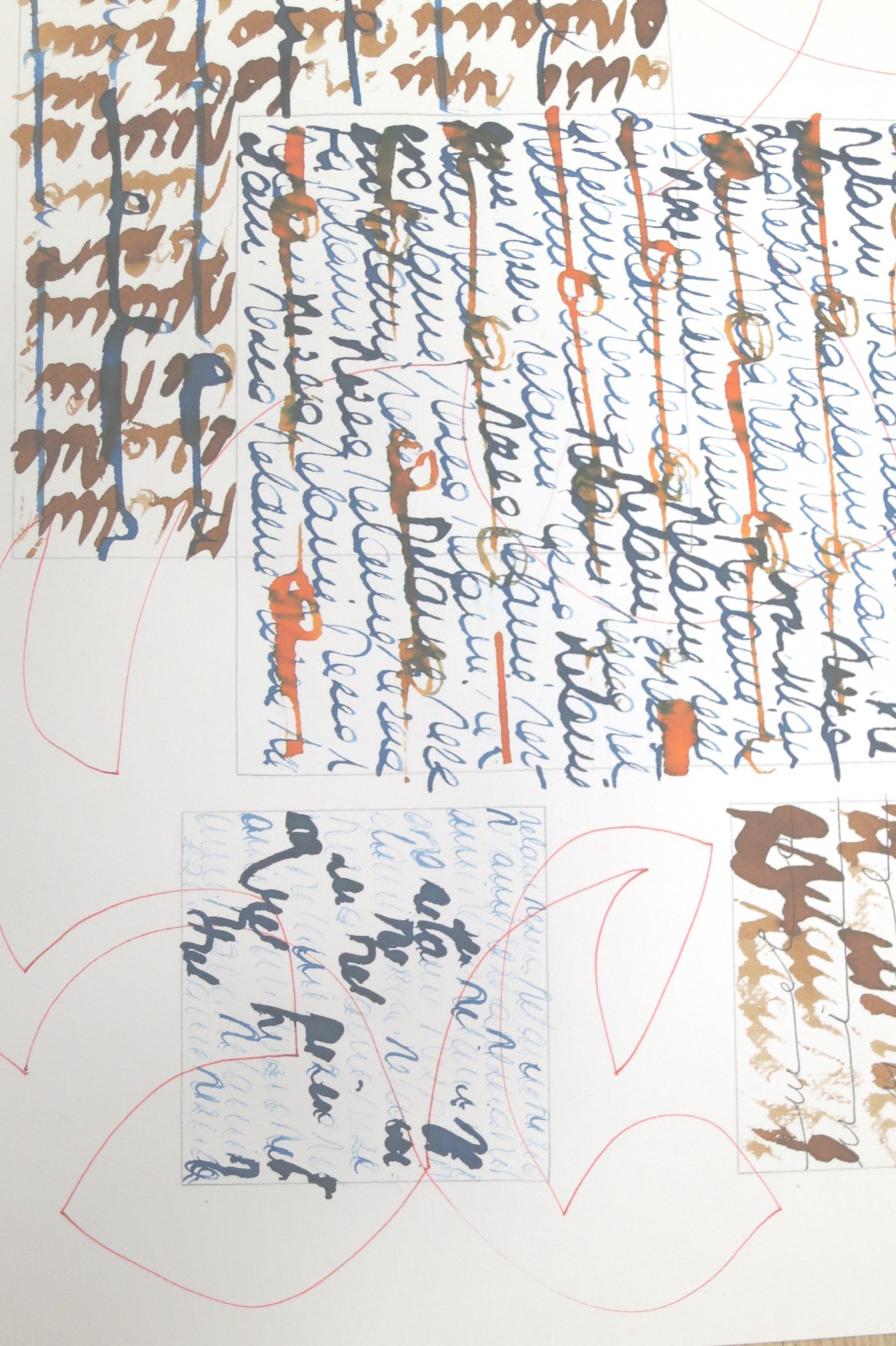 Wir schreiben ohne Buchstaben, nur mit Formen, ganz oft unseren Namen, in lateinischer und hieratischer Schrift, überlappend, groß und klein, orange auf weiß, weiß auf schwarz,…
