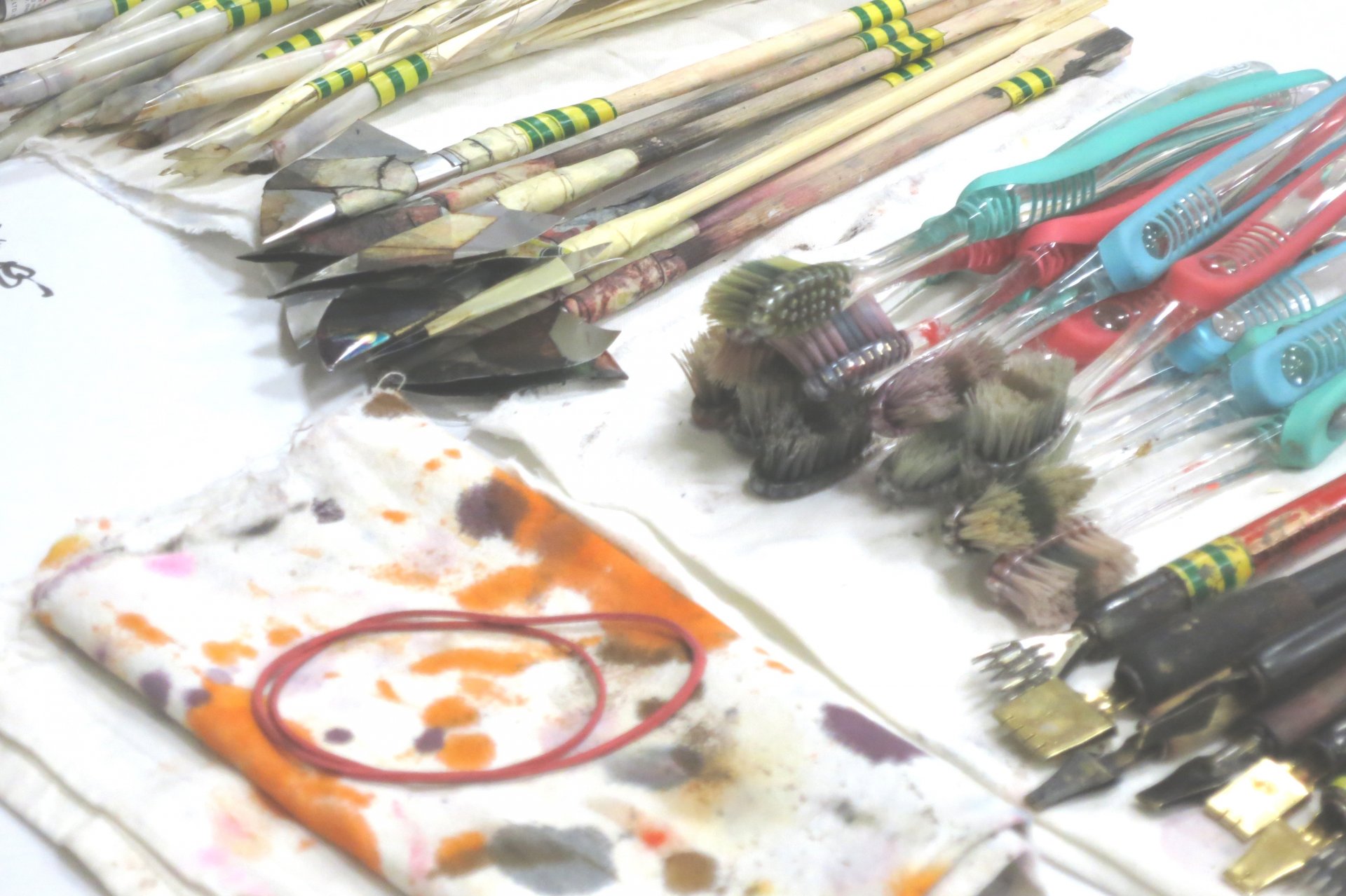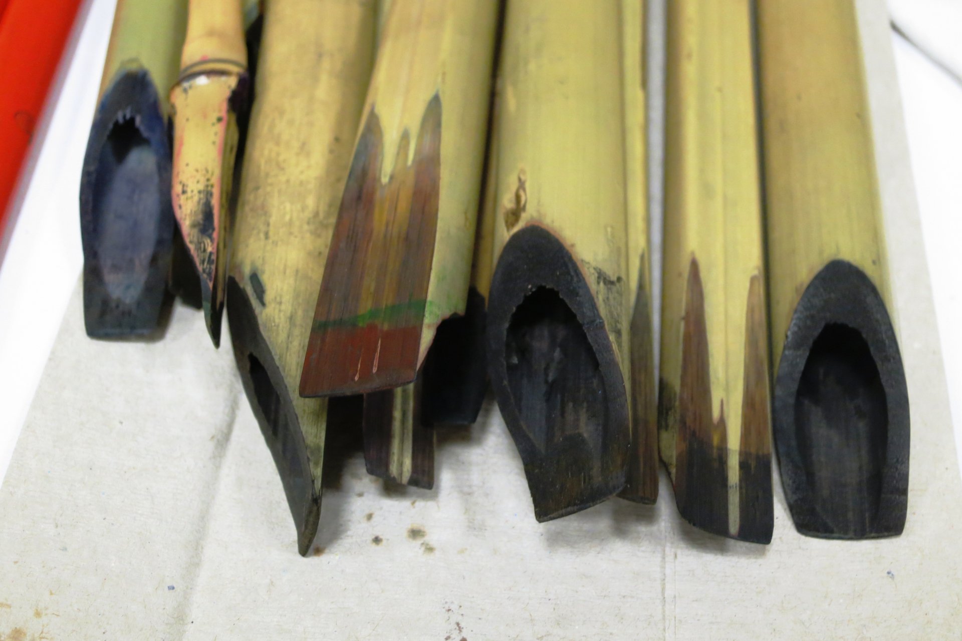 Im Lauf des Workshops schreiben wir mit verschiedenen Werkzeugen – Maurerbleistiften, Bleistiften, Graphitblöcken, Filzstiften, Balsahölzern, Cola-Pens (selbstgemachte Schreibgeräte aus einem Ess-Stäbchen und einem Aludosen-plättchen), Zahnbürsten, Bambushölzern, Federkielen, …. .